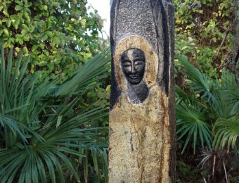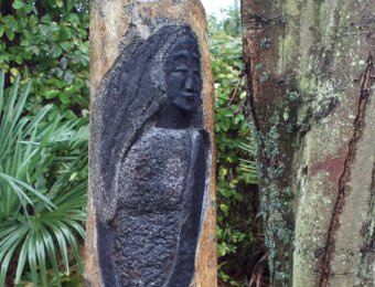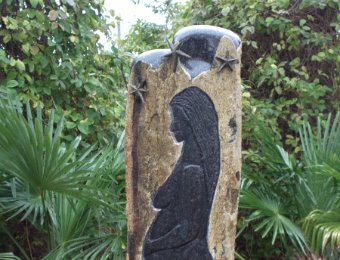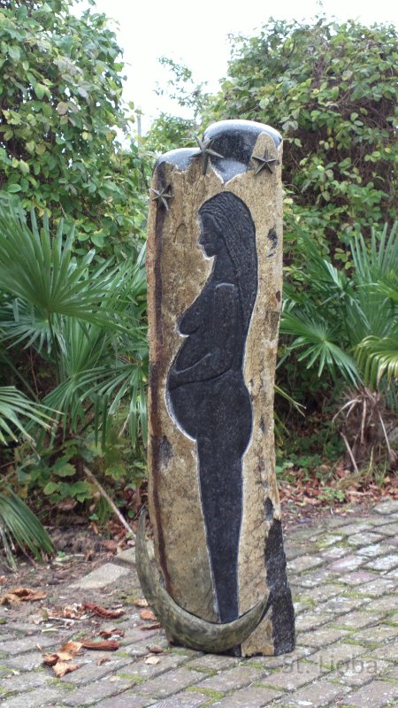 Zwangere vrouw, afgebeeld met de maan onder haar voeten en een krans van sterren boven haar hoofd.
