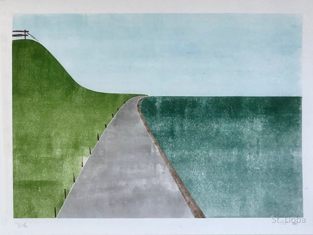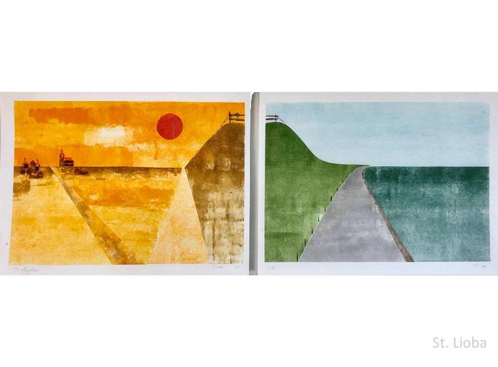 Theotokos.18 cm bij 25 cm. Voorbij het leven.60 cm bij 40 cm. Pieta 12 cm. “Stil Fryslân” (sjabloondruk)of.....de dijk aan het wad bij Midsland, land “Stil Fryslân” (sjabloondruk)of.....de dijk aan het wad bij Midsland, zee “Stil Fryslân” (sjabloondruk)of.....de dijk aan het wad bij Midsland... tweeluik