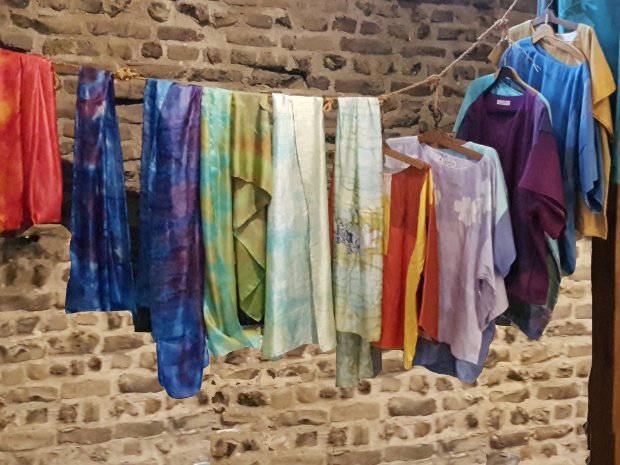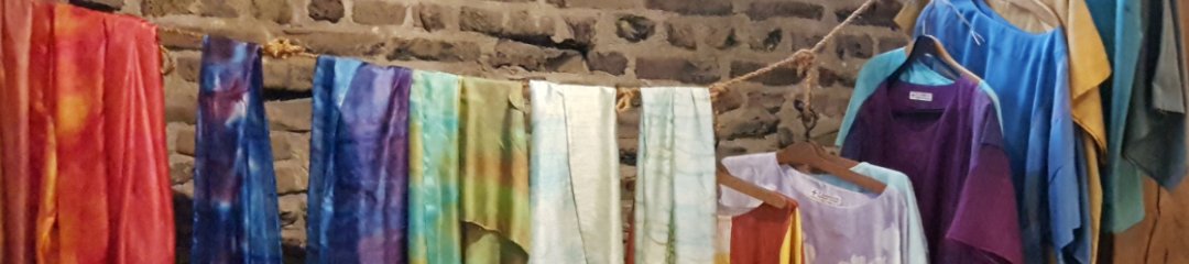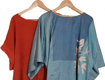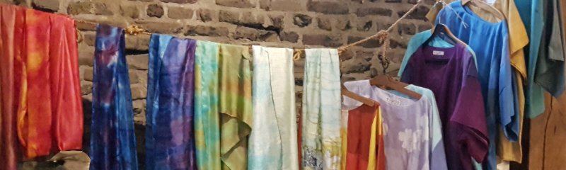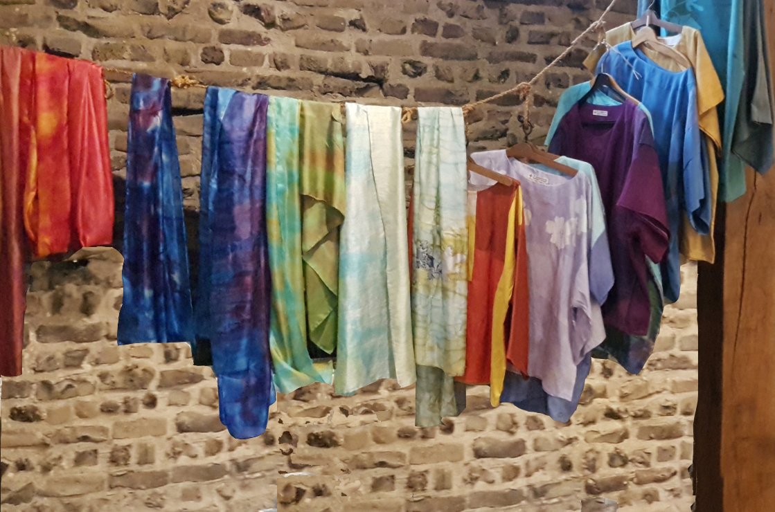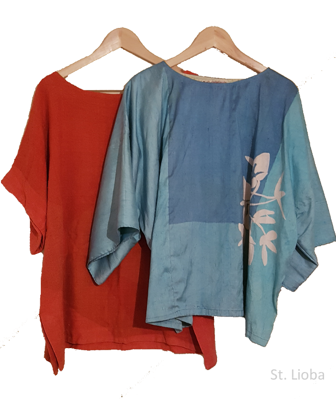 Blouses en sjaals, te passen in de expositie, ook maatwerk mogelijk Lijkwade, afscheidskleed. Eigen ontwerp mogelijk.Batik op ruwe zijde sjaal zijde Blouses kunnen ook in opdracht worden gemaakt.